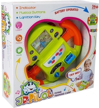 Das Lenkrad enthält verschiedene interaktive Elemente, wie einen blauen Hebel zur Bewegung des Flugzeugs auf dem Bildschirm oder Aufkleber mit einem Cockpit, die einen realistischen Eindruck hinzufügen. Kinder können das Abenteuer mit Drehen des Startschlüssels beginnen.