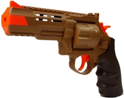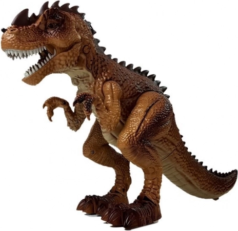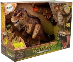 Der interaktive Dinosaurier begeistert alle Fans der Urzeit und actiongeladener Geschichten. Nach dem Einschalten bewegt er sich selbstständig nach vorne, es sind Schritte und ein furchteinflößendes Brüllen zu hören und die Augen leuchten rot. Durch Drücken des Abzugs an der Pistole starten Sie das Duell – jeder Treffer löst Licht- und Soundeffekte aus; beim neunten Treffer bricht der T‑Rex zusammen und spielt einen Niederlageneffekt ab.
