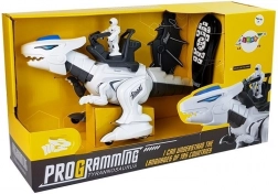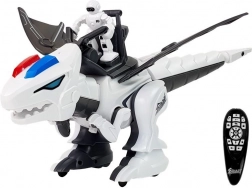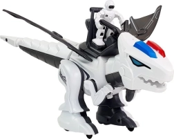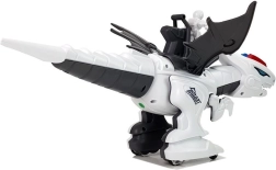 Der Roboter besteht aus robustem Kunststoff in einer weiß-schwarzen Farbkombination mit roten und blauen Details. Sein Design umfasst bewegliche Teile wie Flügel und Beine, wodurch der Dinosaurier lebendige Bewegungen ausführen kann. Ergänzt wird alles durch eine Reiterfigur, die den Dinosaurier „steuert“.