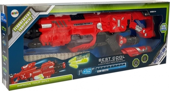 Die im Dunkeln leuchtende Kinderwaffe ist das perfekte Zubehör für jedes Kind, das fantasievolle Spiele liebt. Sie ist mit Lichteffekten ausgestattet, die dem Spiel eine völlig neue Dimension verleihen. Das Magazin leuchtet weiß, wodurch die Projektile auch im Dunkeln sichtbar sind. Ebenfalls enthalten ist ein Laser, der die Flugbahn markiert, und jeder Druck auf den Abzug erzeugt einen realistischen Schussgeräusch-Effekt.