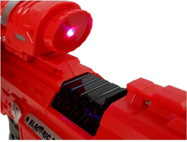 Diese rote und schwarze elektrische Kinderpistole hat ein futuristisches Design, ideal für fesselndes, fantasievolles Spielen.
