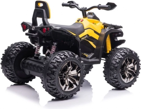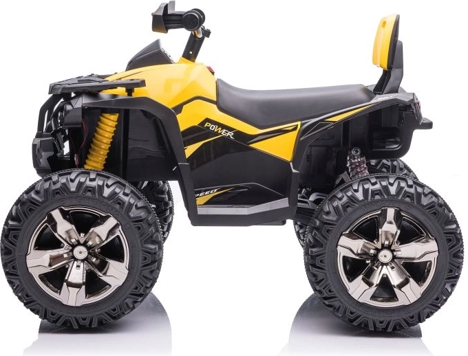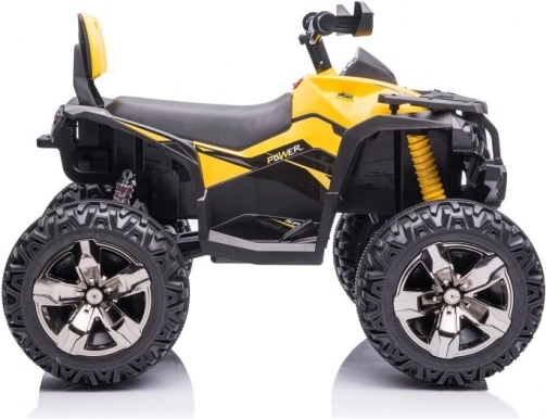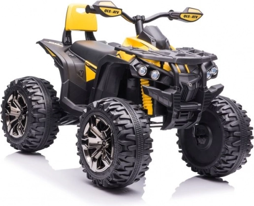 Gelb‑schwarze Ausführung, Lenker mit Spiegeln und Fahrwerksdetails verleihen dem Quad das Aussehen eines echten ATVs.