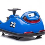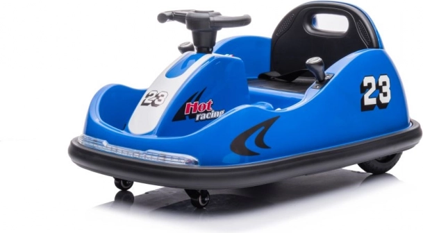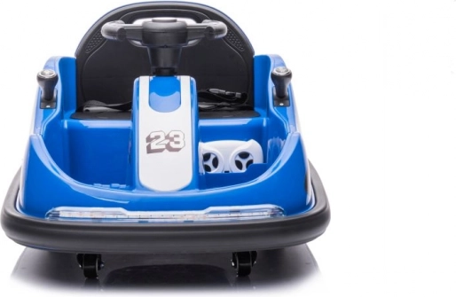Das blaue Kinder-Bumpercar mit der Startnummer 23 und dem Hot-Racing-Design bietet actionreichen Fahrspaß auch auf kleinem Raum. Dank der kompakten Abmessungen und schwenkbaren Rollen beherrscht es präzise Manöver und sanftes Drehen auf der Stelle. Der Sitz mit Rückenlehne und der umlaufende Schutzrand erhöhen Sicherheit und Komfort während der Fahrt.