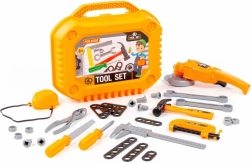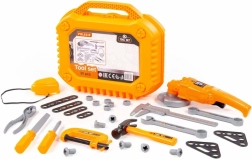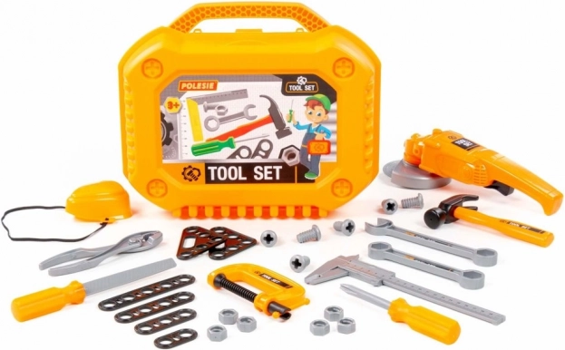 Das Kinder-Werkzeugset ist für kleine Heimwerker konzipiert, die Mama oder Papa bei der Arbeit in der Werkstatt oder im Garten nachahmen möchten. Alle Teile bestehen aus strapazierfähigem Kunststoff, sind sicher zum Spielen und lassen sich leicht im stabilen Koffer verstauen. Die Schleifmaschine dreht die Scheibe nach Druck auf die Taste, die Schutzmaske hat ein elastisches Band und passt somit jedem.