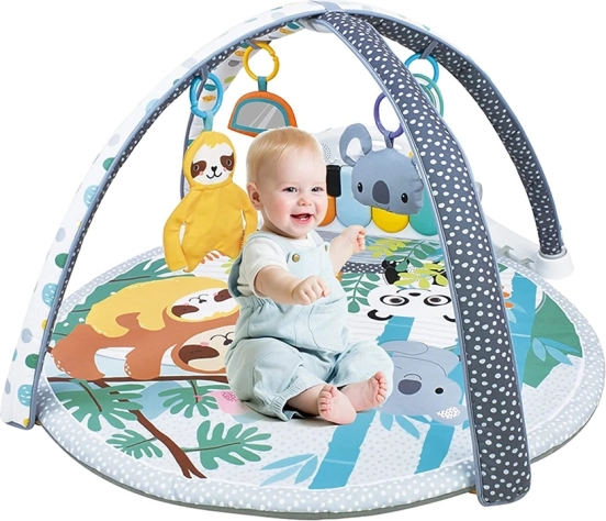 Diese weiche und sichere Lern-Spielunterlage mit Dschungelmotiv bietet dem Baby einen inspirierenden Raum zum täglichen Entdecken. Bunte Hängespielzeuge (Koala, Faultier, Rasseln) und ein Abprall-Panel, das als Spiegel dient, motivieren das Kind auf natürliche Weise zum Strecken, Greifen und Drehen. Enthalten ist ein abnehmbares Klavier mit leuchtenden Tasten, die beim Drücken Töne und Melodien wiedergeben – ideal zur Förderung des Hörsinns und des Rhythmusgefühls.