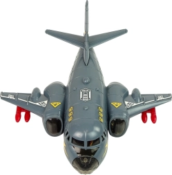 Dieser interaktive Bomber ist ideal für Fans der Armee und Luftfahrt. Das graue Design mit roten Raketen verleiht ein authentisches militärisches Aussehen. Das Spielzeug besteht aus strapazierfähigem Kunststoff und enthält farbige Dioden, die sich am Rumpf und an den Flügeln aufleuchten, zusammen mit realistischen Soundeffekten wie Starten und Schießen.