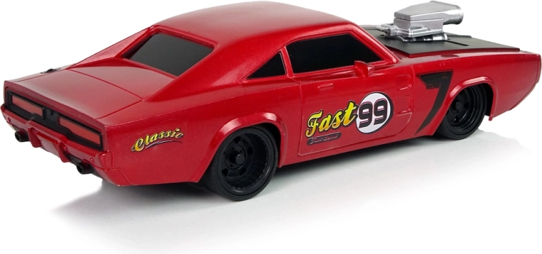 Das Fahrzeug hat eine leichte und robuste Konstruktion, ein sportliches Design mit einem schwarzen Element auf der Motorhaube und einem silbernen Kompressor, was ihm eine krallenartige Note verleiht. Gummireifen sorgen für Straßenhaftung. Die Steuerung des Fahrzeugs macht besonders den Kleinsten großen Spaß, daher ermöglicht die im Set enthaltene Fernbedienung die Führung des kleinen Automodells über zwei separate Tasten für Vorwärts-/Rückwärtsfahrt und Richtungswechsel.