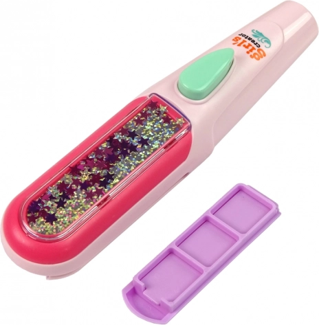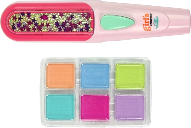 Lassen Sie Ihre Tochter neue Stile durch das Haarfärbeset entdecken, das alles Notwendige zur Dekoration der Haare enthält. Das enthaltene Glätteisen ermöglicht ein einfaches Auftragen der Farben und das Erstellen von Frisuren, die alle Freundinnen in der Schule sicher bewundern werden. Für die einfache Anwendung wählen Sie einfach drei Farben aus, legen Sie sie in den Applikator, besprühen Sie das Haar mit Wasser und ziehen Sie das Glätteisen entlang. Die Frisur ist schnell und mühelos fertig!