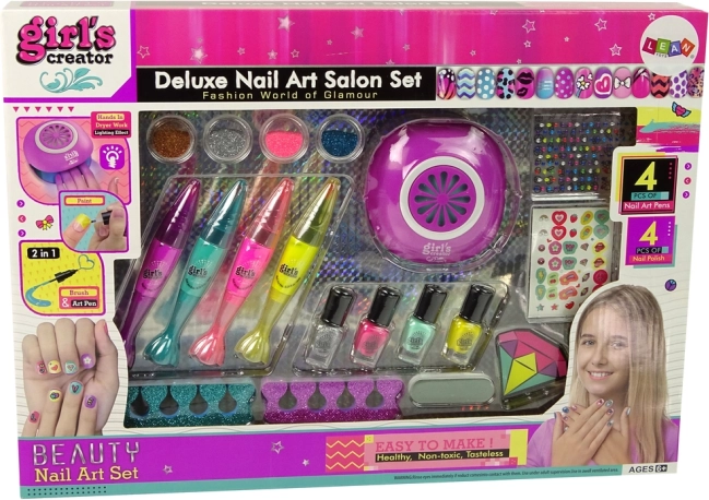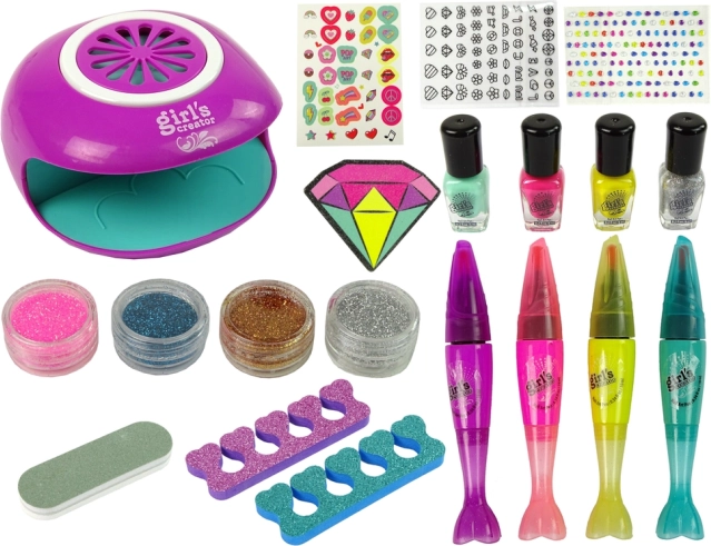 .Nachdem die Länge und Form der Nägel mit der diamantförmigen Feile angepasst wurden, die gewünschte Farbe auf die Nägel auftragen. Als nächster Schritt wird die Hand in eine spezielle Nagellampe gelegt. Sobald die Hand hineingelegt wird, schaltet sich das Licht wie bei einem echten Pendant ein. Die Stifte ermöglichen ein präzises Zeichnen von Mustern und sind in zwei Farben erhältlich. Durch das Malen der Muster entwickelt das Mädchen Genauigkeit und kreiert ihren eigenen Stil. Aufkleber, Diamanten und Glitzer verleihen Originalität und Funkeln.