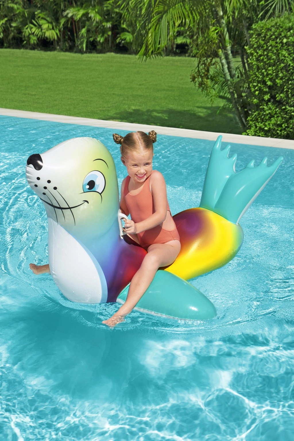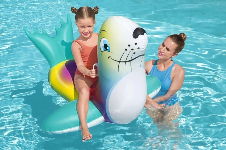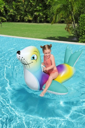 Die niedliche aufblasbare Robbe der Marke Bestway sorgt für jede Menge Wasserspaß für Kinder. Dank der Maße 157 × 114 cm, zwei stabilen Griffen und robustem Vinyl (PVC) bietet sie Stabilität, Komfort und eine sichere Fahrt im Pool, am See und am Meer.