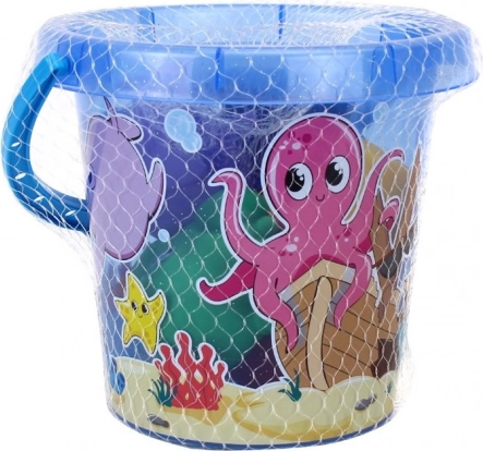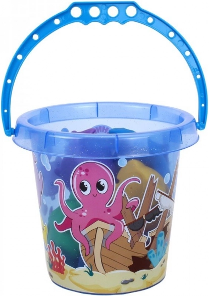 Der Eimer mit blauem Griff und Meeresmotiven ist ideal zum Transport und zur Aufbewahrung von Spielzeug.