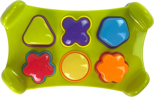 Das obere Panel mit sechs Formen und kräftigen Farben unterstützt die Unterscheidung von Farben und Formen und hält die Aufmerksamkeit des Kindes.