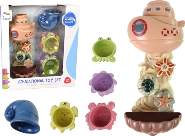 Das Set umfasst Plastikbecher in Form von Meereslebewesen mit Öffnungen, die es ermöglichen, verschiedene Wasserströme zu beobachten.