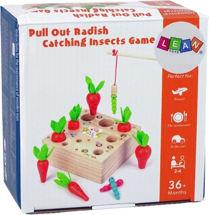 Im Set enthalten sind eine Holzbasis mit Öffnungen, 6 Karotten, 6 Würmchen und eine magnetische Angel. Jede Karotte hat eine andere Größe und gehört in die entsprechende Öffnung, was Sortieren und Feinmotorik fördert. Der Magnet am Ende der Angel ermöglicht das einfache „Herausfischen“ der Würmchen – zufällig oder nach Farbe, was Elemente von Zusammenspiel, Konzentration und spielerischem Gartenabenteuer hinzufügt.