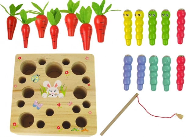 Komplettset mit Basis, 6 Karotten, 6 Würmchen und Angel. Ideales Geschenk für Kinder ab 3 Jahren.