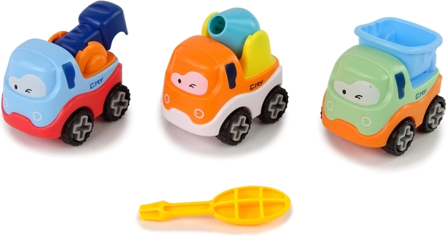 • 3 bunte Konstruktionsautos mit fröhlichen Gesichtern