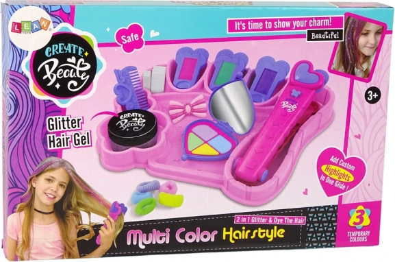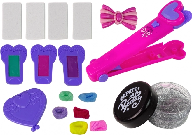 Neben farbigen Strähnchen kann die Frisur mit weiterem Zubehör im Set bereichert werden, wie bunten Haargummis, einer Schleifenhaarklammer, einem Kamm, austauschbaren Schwämmen für das Bügeleisen und einem Glitzergel. Alles ist für komfortables und bequemes Spielen angeordnet.