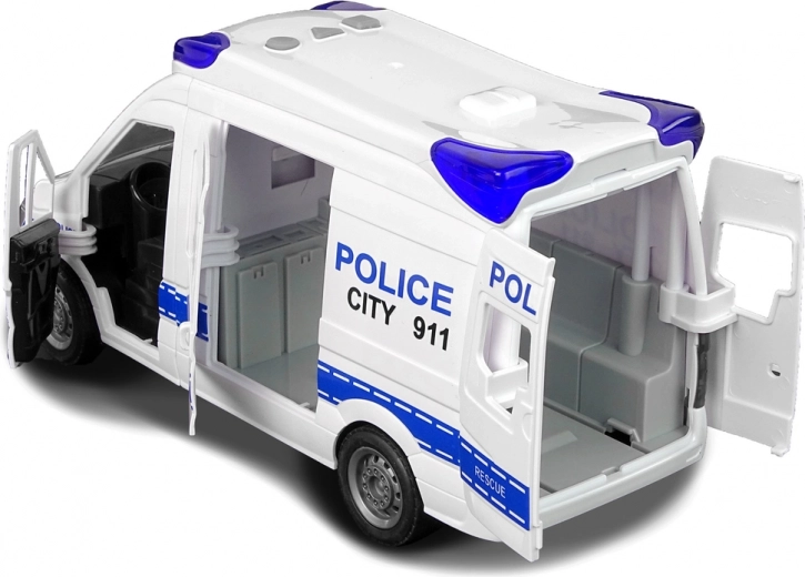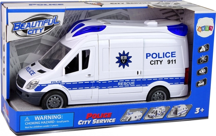Das Polizeiauto mit Sirene und blauem Blaulicht ist die Wahl für jeden jungen Fahrer im Uniformdienst. Das Auto besteht vollständig aus Kunststoff, in Farben, die für Einsatzfahrzeuge geeignet sind. Das Fahrzeug verfügt über eine Aufziehvorrichtung an den Vorderrädern, dank der es selbstständig fährt. Die Ton- und Lichteffekte werden über Tasten auf dem Dach aktiviert.