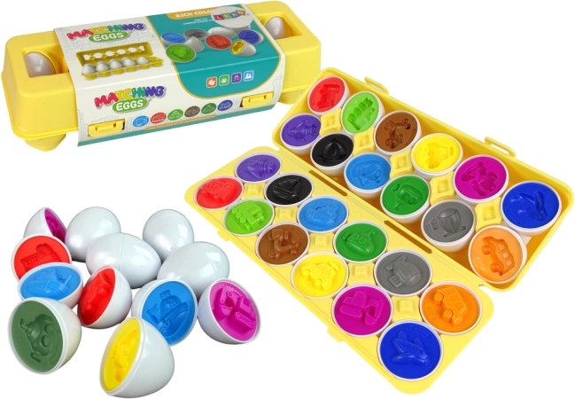 Spaßiges Lernspiel für Kinder: Set aus 12 Eiern mit Fahrzeugmotiven, die miteinander verbunden und nach Form und Farbe sortiert werden. Fördert Feinmotorik, Hand-Auge-Koordination und logisches Denken. Hergestellt aus sicheren, langlebigen Materialien, in einer praktischen, verschließbaren Box in Form einer Eierschachtel.