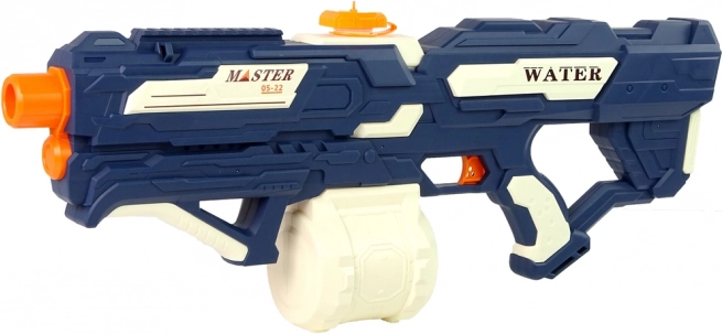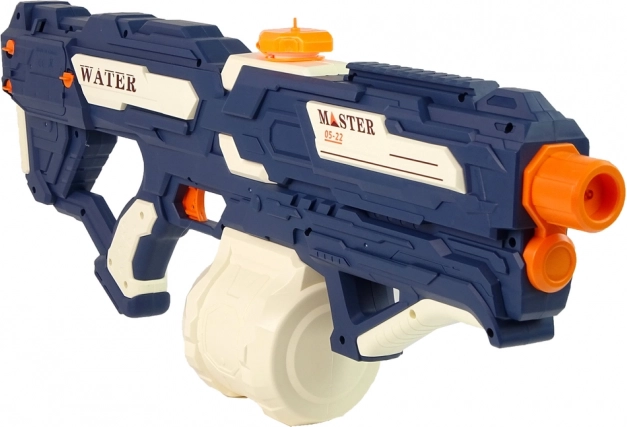 Die vorgestellte Wasserpistole ist blau mit weißen und orangefarbenen Elementen. Die Munition – Wasser – ist sicher, sodass Sie sich bedenkenlos auf ein Gefecht mit Familie oder Gleichaltrigen einlassen können. Unbegrenzter Spaß mit Freunden.