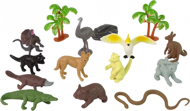 Zum Set gehören Känguru, Koala, Krokodil, Emu, Papagei, Schlange, Schnabeltier, Wombat, Tasmanischer Teufel, Echse, Fennek, 2 Bäumchen und ein Felsen – alles für die Gestaltung Ihrer eigenen australischen Welt.