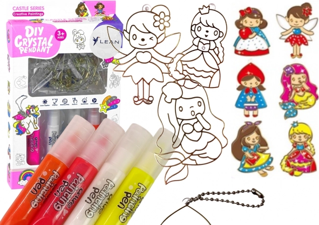 Sechs transparente Prinzessinnenmotive zum Ausmalen verwandeln jeden Nachmittag in eine kreative Werkstatt und schmücken Fenster oder Rucksäcke mit originellen Anhängern.