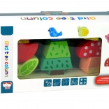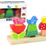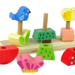 Dieses Holzpuzzle besteht aus einer stabilen Basis mit drei Stiften, auf die Kinder die Holzteile in beliebiger Reihenfolge stecken, sodass sie zueinander passen. Die Teile zeigen Pflanzen, Schmetterlinge und Vögel – die Aufgabe besteht darin, sie ihrer natürlichen Umgebung richtig zuzuordnen, zum Beispiel den Schmetterling zur Blume oder den Vogel zum Baum. Das Puzzle fördert so die Vorstellungskraft und das Wissen über die Natur.