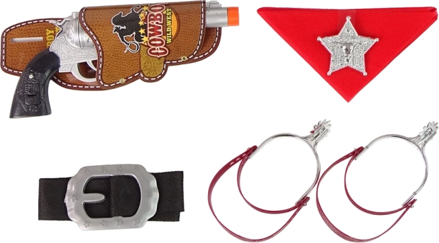 Sheriff-Abzeichen, rotes Halstuch, Gürtel mit Schnalle und Cowboysporen verleihen dem Spiel Stil und Selbstvertrauen. Perfekt für Karneval und Verkleidung zu Hause.