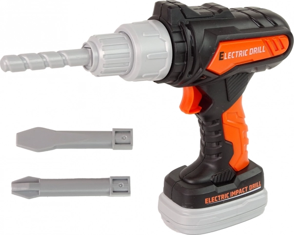 Im Set sind zwei austauschbare Spitzen enthalten, die eine einfache Anpassung an verschiedene Schraubentypen ermöglichen, sowie eine Schutzbrille für sicheres Spielen. Die orange Farbe der Bohrmaschine verleiht ein authentisches Aussehen.