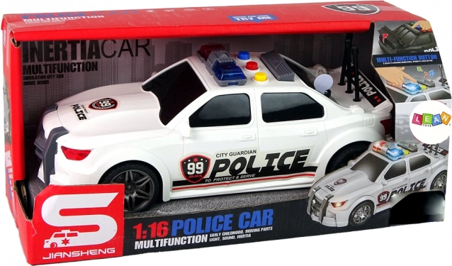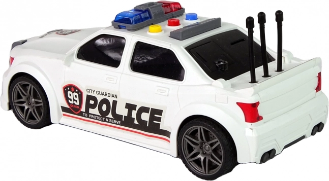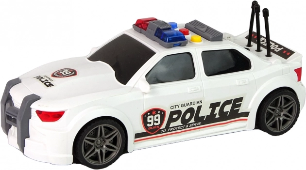 Der weiße Sportwagen mit der Aufschrift City Guardian Police und auffälligen Aufklebern wirkt authentisch und unterstützt kreative Polizeieinsätze.