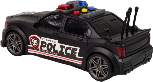 Schwarze Sportoptik mit POLICE-Aufschriften, blau-roten Blaulichtern und Antennen verleiht dem Spielzeug ein realistisches Erscheinungsbild.