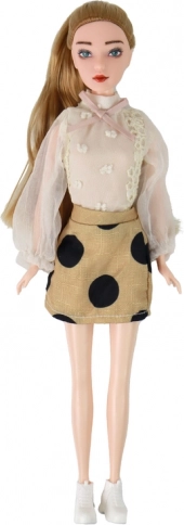 Emily hat lange, leicht kämmbare Haare, ein modernes Outfit mit gepunktetem Rock und eine Brille, die ihren individuellen Stil unterstreicht.