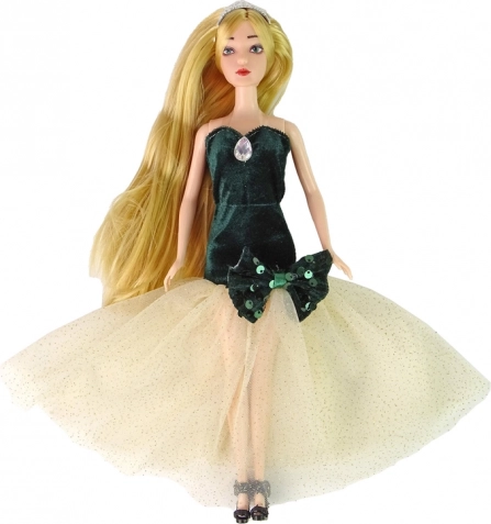 Puppe Emily begeistert mit ihrem edlen Erscheinungsbild: ein dunkelgrünes Oberteil, ein reich ausgestellter Tüllrock mit Glanz und Paillettendetails verleihen dem Outfit besonderen Charme. Schwarze Schühchen mit Rosendekor komplettieren das Ensemble – ideal sowohl zum Spielen als auch für die Kindersammlung.