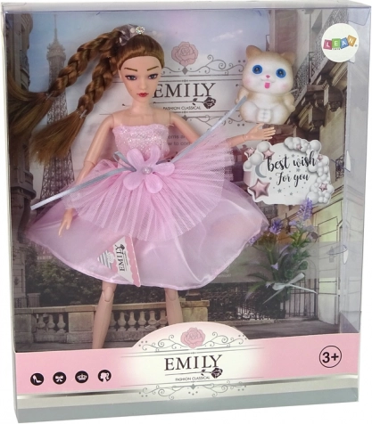 Die Puppe Emily begeistert Kinder, die Mode lieben und eigene Geschichten erfinden. Das rosa Kleid mit Blumenmuster und Schleife, schwarze High-Heels und die feinen Gesichtszüge machen Emily zu einer eleganten Freundin für den Alltag. Dank der beweglichen Gliedmaßen lässt sie sich leicht setzen, hinstellen oder in Lieblingsposen arrangieren.