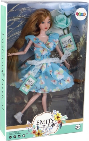 Puppe Emily (30 × 7 × 4 cm) ist die ideale Begleiterin für den Alltag. Die langen, dunkelblonden Haare lassen sich leicht kämmen und stylen, sodass Kinder unzählige Frisuren kreieren können. Das blaue Kleid mit Blumenmuster ist mit einer Spitzenschleife und einem kleinen „Diamant“-Detail am Ausschnitt verziert, was der Puppe einen eleganten Look verleiht.