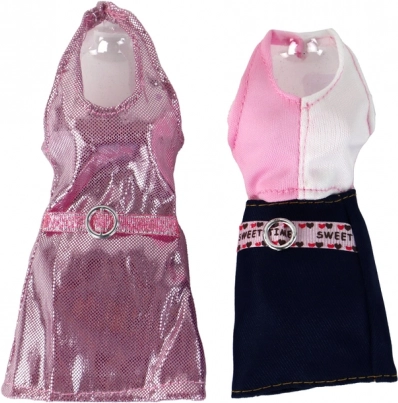 Zwei weitere Kleider, eines mit glitzernder Oberfläche und das andere mit der Aufschrift 'SWEET', bieten endlose Möglichkeiten für Modeexperimente.