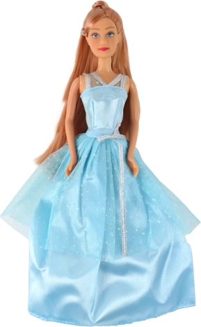 Die Puppe trägt ein langes, glitzerndes blaues Kleid mit Tüllüberwurf und feinen silbernen Akzenten. Ideal für königliche Abenteuer.