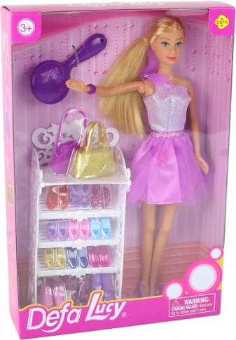 Das gesamte Set enthält auch einen weißen Schrank für Schuhe und Handtaschen, eine rosa Haarbürste zur Pflege der langen blonden Haare der Puppe, alles verpackt in der Originalverpackung mit den Maßen 32 cm x 21 cm x 6 cm.