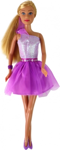 Kleiden Sie Ihre Puppe Lucy in ihr elegantes lila Kleid mit glitzerndem Oberteil und ausgestelltem Rock. Zum Kleid gehört auch ein lila Gürtel, verziert mit Pailletten, der ihre Silhouette betont.