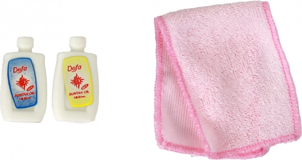 T-Shirt mit Print, Jeansröckchen, rosa Handtuch und Mini-Fläschchen fürs Kosmetikspiel – alles an einem Ort für abwechslungsreiche Geschichten.