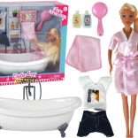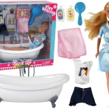 Dieses Bade-Set bietet alles, was Kinder für realitätsnahes Spiel brauchen: eine elegante weiße Wanne auf Füßen, eine Puppe mit langen blonden Haaren, die sich leicht kämmen lassen, sowie zahlreiche Accessoires für Pflege und Stil. Der blaue Bademantel verleiht der Puppe Komfort und Pfiff – bereit für Entspannung und Spaß.