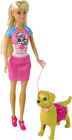 Niedliches Set für Tierliebhaber: Puppe mit Hündchen, das du füttern, an der Leine spazieren führen und dabei Pflege und Verantwortung lernen kannst. Die Puppe hat bewegliche Gliedmaßen, der Hund reagiert mit Bewegungen von Schwanz, Ohren und Maul, und enthalten sind Napf mit Futterkügelchen, Leine, Mülleimer und Schaufel.
