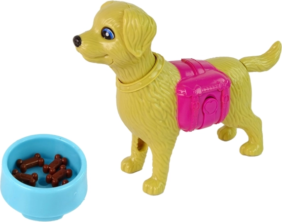 Der gelbe Hund hat einen beweglichen Schwanz, Ohren und ein Maul. Dank des rosa Vorratsbehälters und des Napfs mit Futterkügelchen kannst du ihn immer wieder füttern und deine Fantasie entfalten.