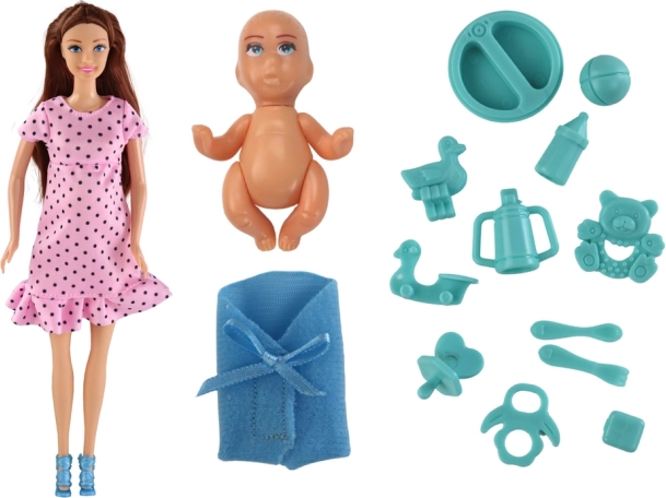 Das Set enthält verschiedene Accessoires wie Spielzeug, Fläschchen und Lätzchen für Spiel und Pflege.