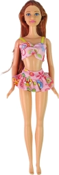 Die Puppe hat lange, braune Haare und trägt ein rosa Muster, perfekt für sommerliche Abenteuer.