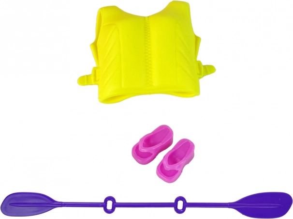 Das Set enthält eine gelbe Schwimmweste und ein lila Paddel, die Kindern ein realistisches Wassererlebnis bieten.