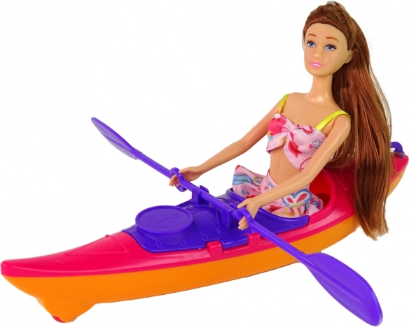 Entdecken Sie das Abenteuervergnügen mit diesem erstaunlichen Puppen- und Kajakset. Die Kollektion umfasst eine Puppe in bunter Strandkleidung, die bereit für Wasserabenteuer ist. Das lange braune Haar der Puppe glänzt wunderschön in der Sonne und die rosa Sandaletten verleihen eine ordentliche Portion Stil. Das leuchtend rosa Kajak bietet realistische Spielfunktionen mit einem beweglichen Paddel und einer gelben Schwimmweste für sicheres Spielen im Wasser.