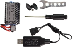 Im Lieferumfang enthalten: Boot, 2,4-GHz-Sender, Anti-Kollisionsabdeckung, Akku, USB-Ladekabel, Ersatzschraube, Schlüssel, Schraubendreher, Ständer und Anleitung.