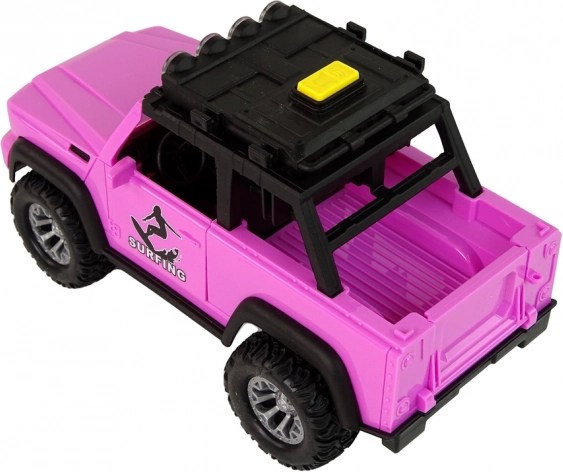 Genießen Sie Sommerfeeling mit dem rosa Offroad-Fahrzeug im Surf-Thema. Realistische Details, große Räder und der Schwungradantrieb sorgen für eine ruhige Fahrt, während Lichter und Sounds jede Fahrt in ein Abenteuer verwandeln. Surfbretter und Paddel auf dem Dachträger regen die Fantasie an und laden zu Strandgeschichten ein.