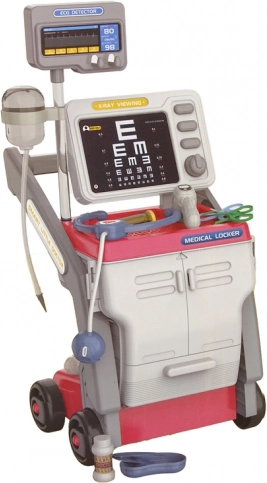 Dieses attraktive Arztset in Weiß-Rosa begeistert alle kleinen Medizin-Fans. Enthalten sind ein fahrbarer Stand, ein funktionsfähiges batteriebetriebenes Stethoskop (3×1,5 V, nicht im Lieferumfang enthalten), eine Spritze, Schere und weiteres unverzichtbares Zubehör. Dekorative Aufkleber verleihen dem Stand einen authentischen Look.